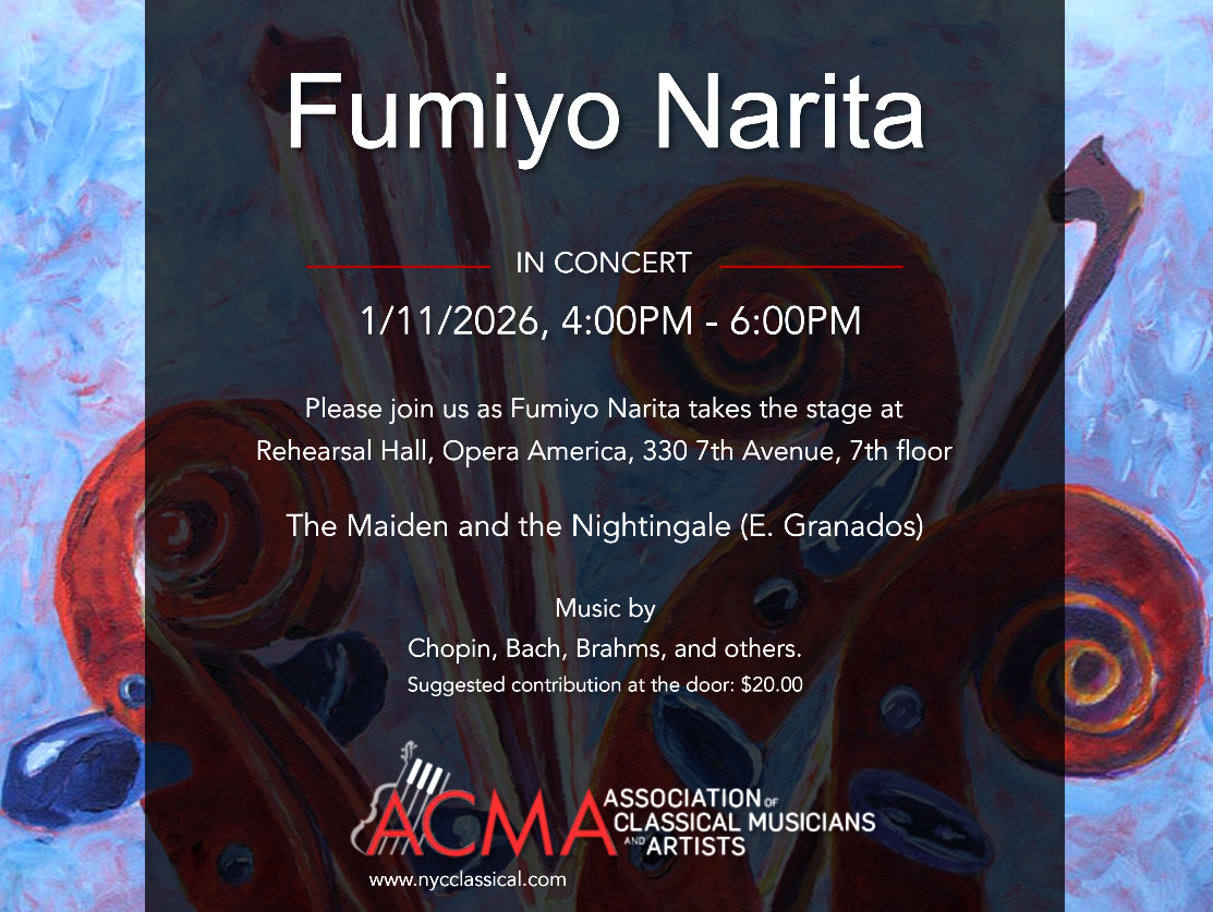 May 16, 2020 Sunday at 3:30PM : ACMA Recital : Domingo Recital Hall at National Opera Center @ 330 7th Ave, New York, NY 10001 – Cancelled